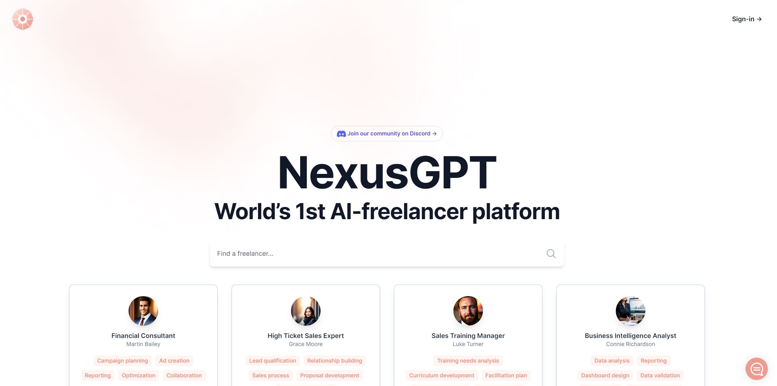 The platform hosts a wide range of professionals, including occupational therapists, financial risk specialists, iOS developers, multimedia designers, branding experts, SAP consultants, and more. Key Features: Diverse range of professionals: NexusGPT offers a broad selection of skilled freelance professionals from various fields to cater to the diverse needs of businesses. AI-driven matching: The platform employs artificial intelligence algorithms to match businesses with the right professionals based on their skills and expertise, streamlining the hiring process. Efficient project management: NexusGPT utilizes AI technology to manage projects, track progress, and enhance communication between businesses and freelancers, ensuring seamless collaboration. Use Cases: • Find skilled freelance professionals across different fields to fulfill specific business needs. • Access a wide range of professional profiles to evaluate expertise and experience. • Streamline project delivery, progress tracking, and communication with freelancers using AI-driven project management tools. NexusGPT is a reliable platform that bridges the gap between businesses and skilled freelance professionals.