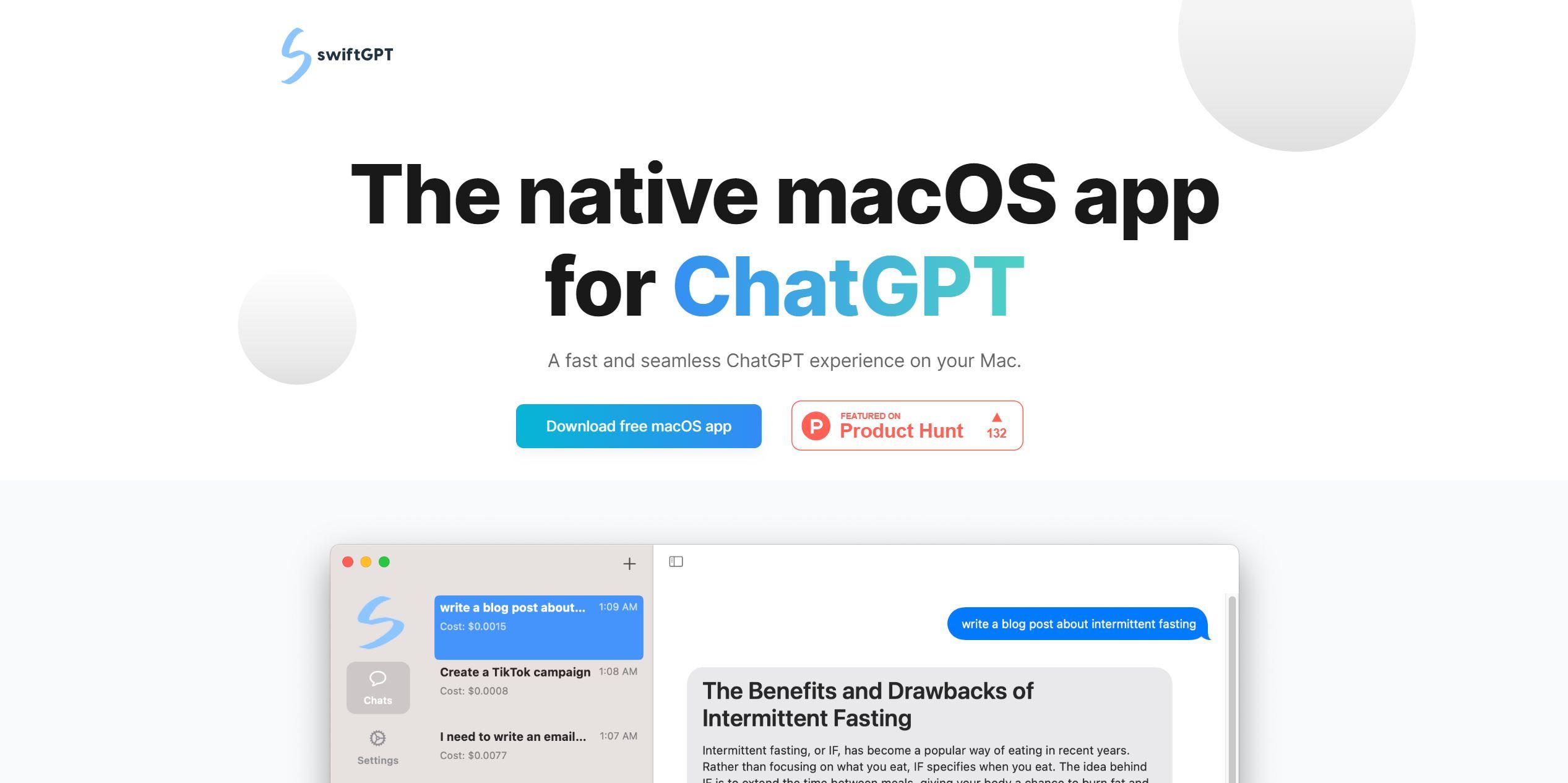 swiftGPT.app is a native macOS app that offers a smooth and fast ChatGPT (Generative Pre-trained Transformer) experience. It provides users with a user-friendly chat interface to effortlessly interact with OpenAI's conversational AI. Key Features: Native macOS App: Enjoy a native and optimized ChatGPT experience on macOS devices. User-Friendly Chat Interface: Engage in conversations with OpenAI's conversational AI using a familiar chat-like environment. Conversation History: Access and refer back to previous conversations for better context and information retrieval. Cost Tracking: Monitor individual and total expenses associated with ChatGPT usage. Light and Dark Modes: Personalize the app's interface based on light or dark themes. Customizable with Own API Key: Use your own API key to tailor the ChatGPT experience to your preferences. Use Cases: macOS users who want to have a smooth and optimized ChatGPT experience on their devices. Individuals seeking a user-friendly chat interface to engage in conversations with OpenAI's conversational AI. Users who require easy access to conversation history for context and information retrieval. Those interested in monitoring and tracking their expenses associated with ChatGPT usage. macOS users who prefer personalized interfaces with light or dark themes. Individuals who want to use their own API key to customize their ChatGPT experience. swiftGPT.app provides macOS users with a powerful tool to enhance their ChatGPT experience.
